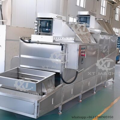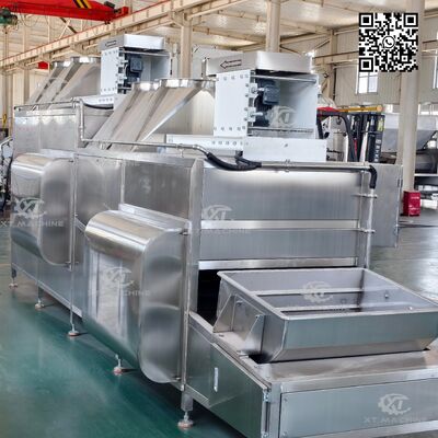 Das Kühlförderband ist mit einem Motorreduzierer für präzise Geschwindigkeitskontrolle ausgestattet. Ein Hochdruck-Luftgebläse, das oben am Förderer installiert ist, entfernt effektiv Feuchtigkeit von blanchierten oder frittierten Erdnüssen und gewährleistet so eine optimale Produktqualität.